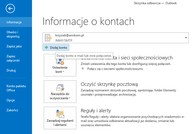 Z menu głównego wybieramy PLIK > Dodaj konto.