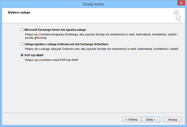 Wybieramy usługę IMAP.