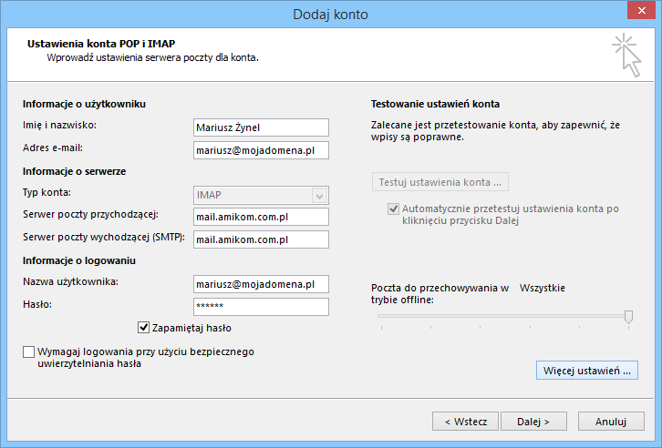 Wpisujemy ustawienia konta: