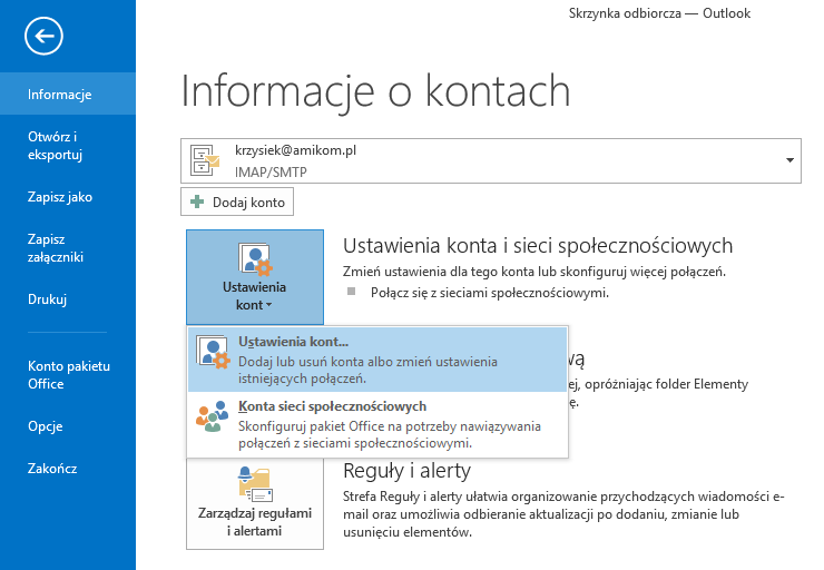 Z menu głównego wybieramy PLIK > Ustawienia kont.