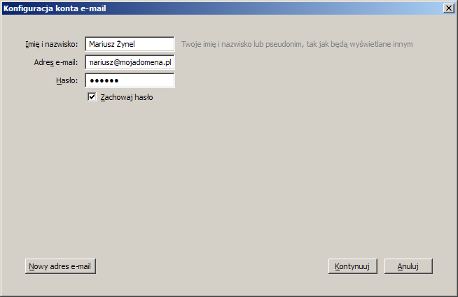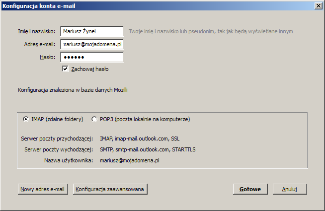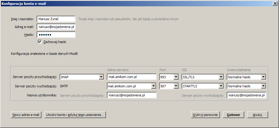 nazwa użytkownika dla obu serwerów: pełny adres e-mail taki jak podano wcześniej np. mariusz@mojadomena.pl.